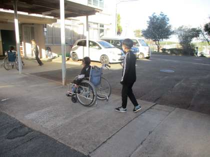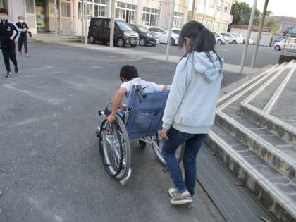 子どもたちから「普段通っていて坂と感じたことはなかったけれど,車椅子に乗ったらすごく斜めになって怖かった。今日は近くにペアの人が見守ってくれていたけれど,もっと急な坂を車椅子の人が一人で行くならすごく怖い思いをしていると思う。」「普段何気なく越えている段差もタイヤが空回りして進めなかった。こんな段差がまちにはたっくさんあるからもっとみんなにとって住みやすい環境になればいいと思った。」などの振り返りがありました。