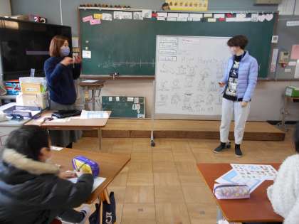 今日は,ALTの先生に「冬から連想する言葉を英語では,どんなふうに言うのかな。」について教えていただきました。「マフラーは,スカーフと言うんだね。」「おもちは・・・?」「へえ,ライスケーキて言うんだ!」と新しい発見がたくさんあったようです。子ども達の笑顔と「なるほど!」が溢れたステキな時間でした☆