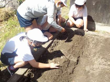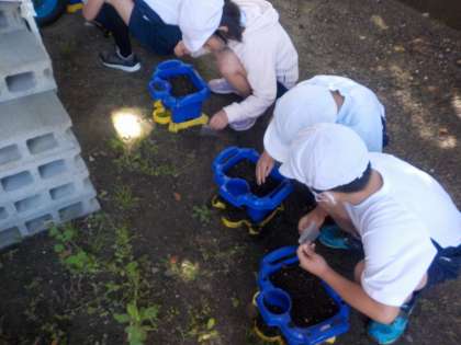 理科の学習で,ヒマワリの種を3年生の花壇にまき,ホウセンカの種を自分の植木鉢にまきました。芽が出るのが楽しみです。今後の成長をしっかり観察していきたいと思います。
