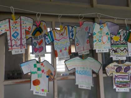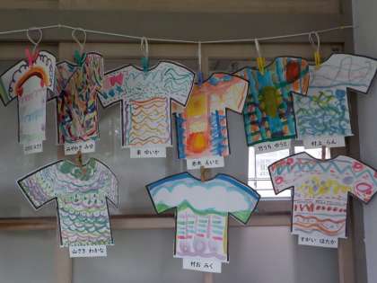 絵の具をまぜたり,水の量を変えたりして色々な色,線や形などであらわした「世界に1枚だけの自分のTシャツ」を教室にかざりました。
