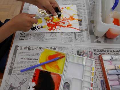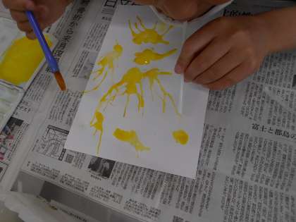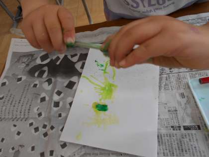 今日は,いろいろな道具を使って絵の具で色付けをしました。『この色の出し方面白いな。』,『上手にできたよ。』など楽しみながらか,技法を知ることができました。