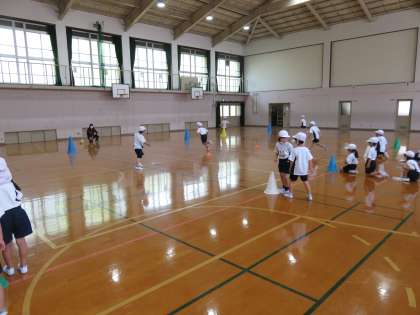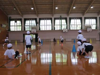 「くねくね」「ぐるぐる」「ぴょんぴょん」の3つのポイントをいかに素早く走り抜けるかを実際に体を動かしたり,友だちの動きを見て考えたり,楽しい時間を過ごしています。