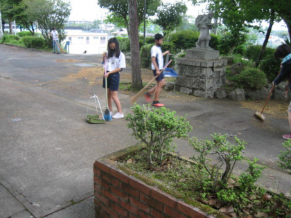 本校には二宮金次郎像がありますが,昨日の雨や風で,木々の小さなつぼみや葉がいっぱい落ちてきて,金次郎像の周りに散乱していました。それを5年生が掃除時間にきれいに掃いてくれました。金次郎さんも喜んでいることでしょう。