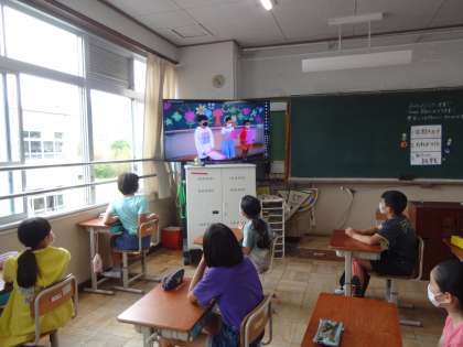 5年生は,明るく元気に,そして礼儀正しくハキハキとメッセージを伝えることができました。自分たちで作った動画や他の学年の動画を見ている顔は,とってもいい表情で,笑顔があふれていて幸せな気持ちになりました。クラスの代表として力を発揮してくれた本部委員の友達にも「がんばって!」と声をかける姿,他の学年の動画のすごいところを素直に「すごい。上手やな…。」と認める姿…。史上最高の5年生だと先生は思っています。体育館で集まれなくても,教室が離れていても,「想い合う心」を忘れずに歩んでいきたいです。