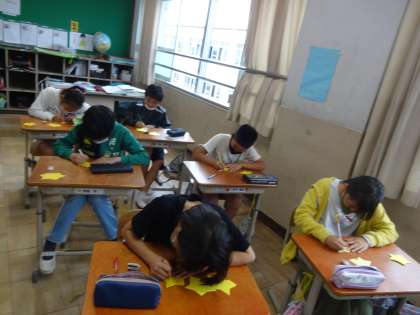 5年生になり,約1カ月半が過ぎました。毎日,一緒にいる友達には,良い所がたくさんあります!!先生も,この短い期間にみんなのキラキラを山盛り見つけました。良いことをどんどん伝え,広めていこう!ということで,今日は,キラキラ見つけを行いました。友達のキラキラを見つけることがとっても上手で,メッセージを書く姿から”愛”が伝わってきました。丁寧な字で,一生懸命友達にメッセージを書く優しい時間が流れていて,クラスのみんなが笑顔になったよ。