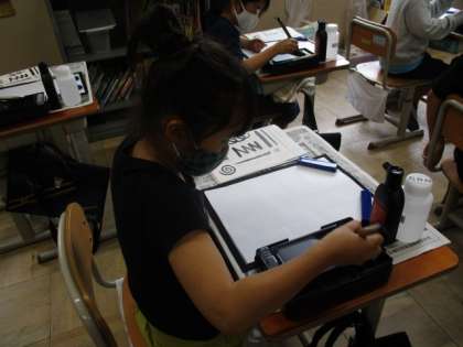 3年生では,毛筆の学習が始まりました。まずは,良い姿勢で「こし ぴん」「足 ぺた」「ぐう 一つ」をみんなで意識しました。すずりにぼくえきを初めて入れる子供たちは大興奮!どのくらい入れるのが確かめながら,慎重に入れていました。筆の「ほ」の柔らかさを利用して,細い線や太い線,グルグル線などをかきました。「力の入れ方で,細さが変わる!」など驚きながら取り組んでいました。
