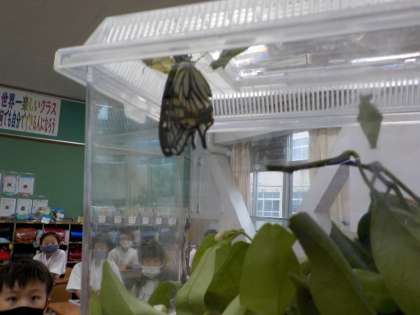 今日の5時間目の学習中に,教室で育てているアゲハチョウが,さなぎからチョウになりました。感動的な場面に出会うことができて,子ども達もとても喜んでいました。