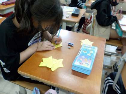 3年1組の友達の頑張っているところやいいところなどを見つけて,キラキラカードに書きました。授業中,遊び,当番活動などいろいろな場面で頑張っている姿を見つけることができました。また,「3年1組みんなのキラキラ」をキラキラロードに掲示したいと思います。