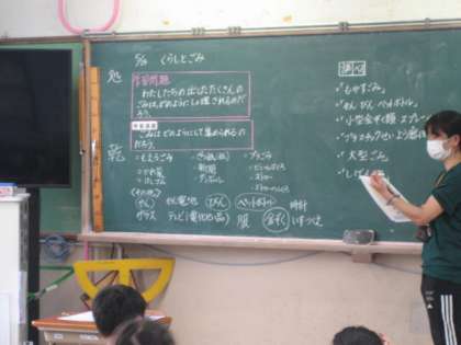 4年生は社会科の学習でした。ごみの種類を発表し合い,それらのごみがどこに行くのかを予想し,単元の学習問題をつくっていました。