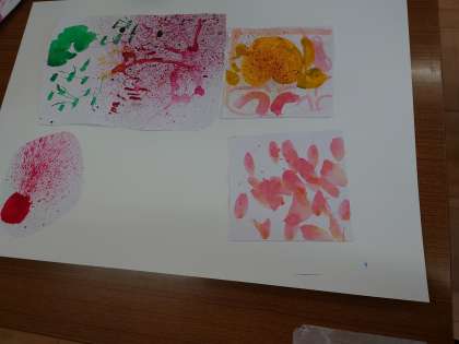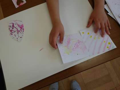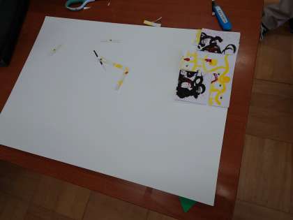 前にいろいろな「心のもよう」を作りましたが,それをつなげて一つの作品を作ることにしました。形に切ったり,組合せを考えたりと,いろいろ工夫しています。一体どんな作品になるのでしょうか?