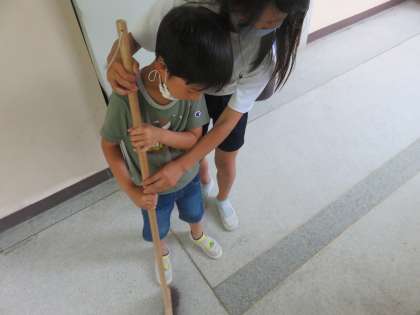 6年生のお姉さんにほうきの正しい掃き方を教えてもらう人。