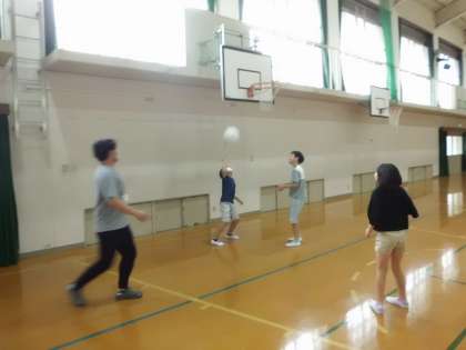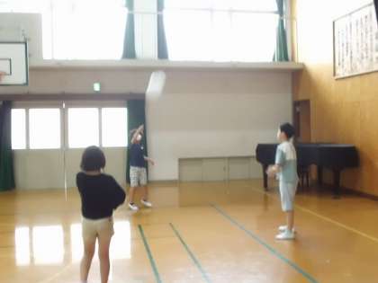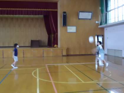 たけのこ学級では,朝の会が終わり,畑仕事が終わるとみんなで体を動かす「朝の運動」の時間があります。みんながいるから,いろいろなスポーツもできて,楽しく運動することができます。運動だけでなく,みんなで1つのことをする楽しさにも気づいてほしいと思います。今,ソフトバレーボールをしています。お友達につなぐボールを考えたり,困っている友だちに教えてあげたりして気持ちもつなげられるようにしています。少しずつつながりができてきています。