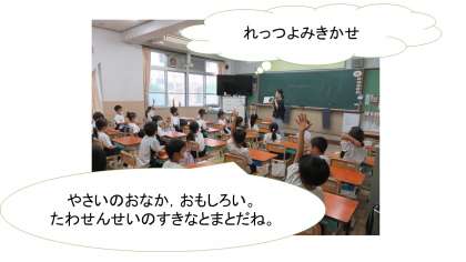 今日は,栄養教諭の先生に「やさいのおなか」の絵本を読み聞かせしていただきました。国語の学習で「くちばしくいず」を作っていますが,野菜の断面を見てなんの野菜かを当てるこの絵本はとてもタイムリーでした。