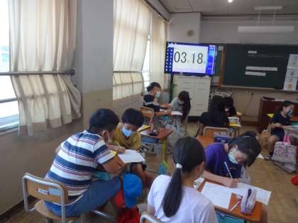 「What do you have on 〜」各曜日に何の教科がたずねることができるようになり,ペアトークしました。協力し合って,ペアトークする姿を思わずパシャリ。教え合い,助け合って学び合う姿が最高です。