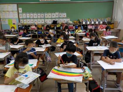 図画工作「わたしの6月の絵」では,6月を感じるものを想像しながら,いろいろな色や作って,思いうかんだことを絵にあらわしています。絵の具の使い方も随分と上手になり,楽しんで活動しています。