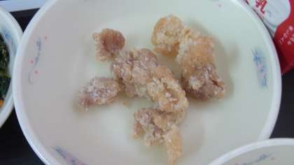 鶏肉のからあげは,とり肉を塩こしょう,料理酒に30分ほどつけて,片栗粉,米粉をまぶして揚げました。