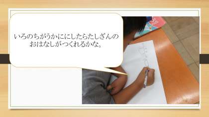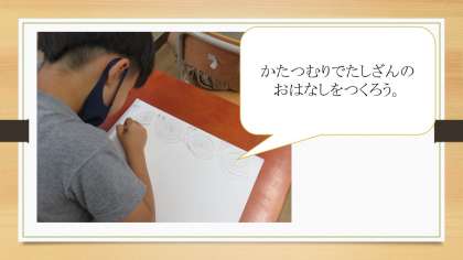 たしざんやひきざんになるお話を絵を描いて作りました。かたつむりやかえるが出てくるお話を一生懸命考えていました。
