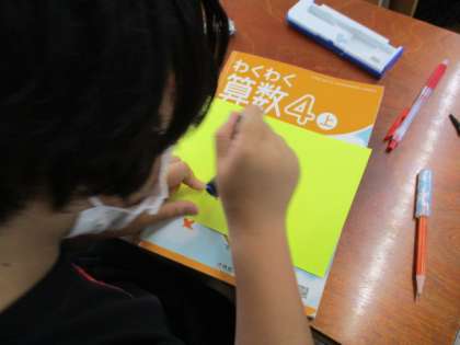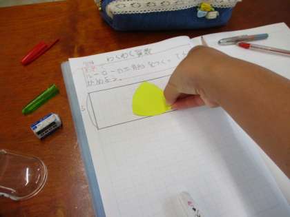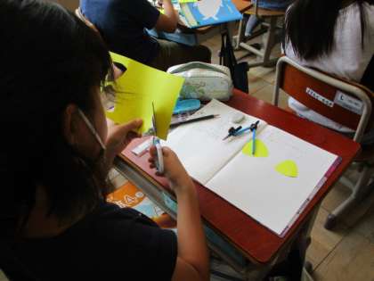 算数科では「ルーローの三角形」を作りました。正三角形をかいてから,コンパスでかいたり,一辺の長さだけかいて,コンパスを使ってかいたり,それぞれのかき方で作成していました。まずは,5センチ,次に6センチなど長さをかえていくつか完成させ,ノートに貼りました。子どもだちは,楽しみながら活動してあっという間に算数の時間が終わったことに驚いていました。