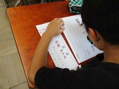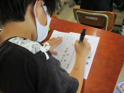 書写の学習では,硬筆書写をしました。見本の字をよく見て,ゆっくり丁寧に書き上げていきました。1枚書けたら「ふーっ。」と息つきながら,2枚目に取り組んでいました。チャイムが鳴ると,「疲れたー!」という声が次々を聞こえ,とても集中していたことが分かりました。