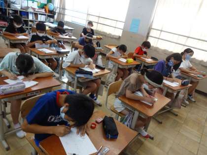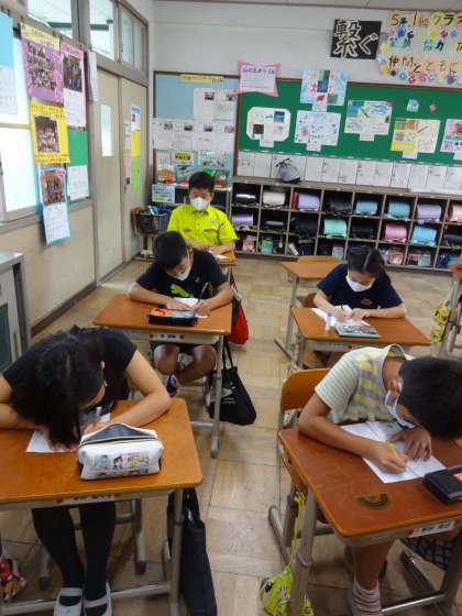 先日,書写の学習で,硬筆に挑戦しました。竹取物語をお手本通りに,一画一画,書き順に気をつけて整った字で書きました。ピンとした緊張感の中,ものすごく集中して書きました。気持ちがいい緊張感のなか,頑張って書いた字はどの字も美しくキラキラしています。友達の字を見て,「うわぁ。すごい!とっても上手。」とお互いに認め合う姿もキラキラしていました。素直に認め合えるところ,先生は,大切にしていきたいです。