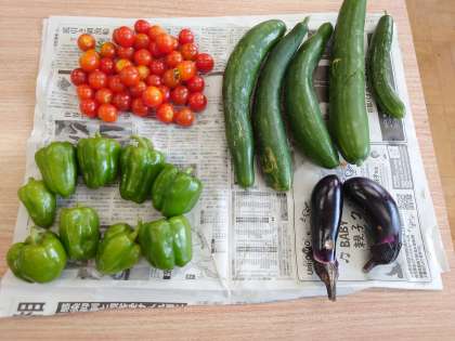 サマースクール1日目。学習の前に畑の水やりと収穫などお世話をしてくれました。この連休で野菜たちがとても大きく育っていました。お店やさんが開けそうです。お世話になった方々にも配りました。