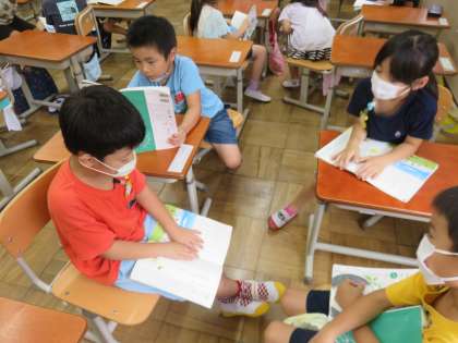 国語科の時間には「いちねんせいのうた」という詩を音読しました。初めは先生と一緒に,次は一人で。そして最後は近くの席の友だちと読むところを相談して決めて。