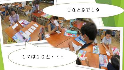 算数の時間は数のカードを使って,「10といくつゲーム」をしました。11から20までのカードを1枚ずつ出し合い,「10と3で13です。」「10と7で17です。」と答え合います。