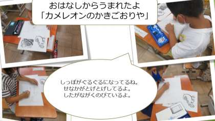 図画工作の時間は,「カメレオンのかきごおりや」のお話を聞いて思い浮かんだことをお話にする学習に入りました。
