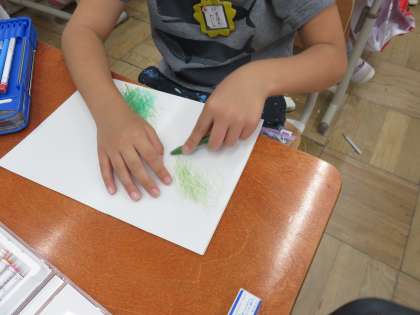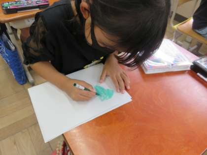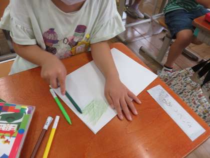 先週は花を色水にして和紙を染めました。今週は葉っぱを紙で挟んで色鉛筆でこすって染めました。葉脈まできれいにこすり出すことができてとても満足していました。
