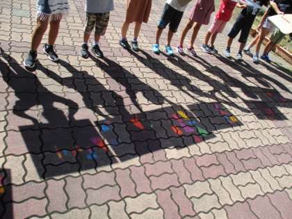 地面がカラフルに光って,「わあ,きれい!」とみんな 大喜び。