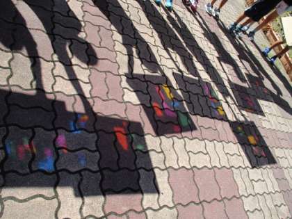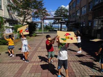 完成した「ひかりのプレゼント」の作品を外に持っていて