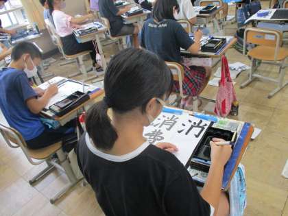 2学期初めての書写をしました。題材は『消費税』。これまで社会科の学習で,消費税は何のためにあるのか,どんなことに使われているのかについて学習してきました。私たちの生活を支える消費税,一画一画思いを込めて書きました。あなたたちの真っ直ぐな姿勢と心。字にそれがすべて写し出されているような気がします。三字でバランスが取りづらそうでしたが,最後まで頑張っていました☆