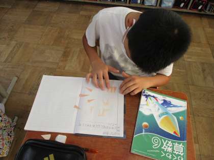 円を細かく等分に切ったものを組み合わせていくと・・・。なんと長方形になりました!「これだったら円の面積求められるかも!」と意気込み,そこから円の面積を求める公式をみんなで考えだしました。