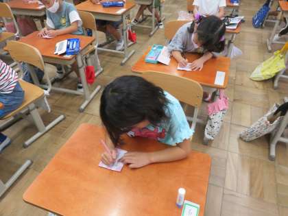 袋の表書きには,「1ねんせいへ おめでとう」と書くことに,そして裏書には自分の名前を書くことに決まりました。とても丁寧に書く子どもたち。