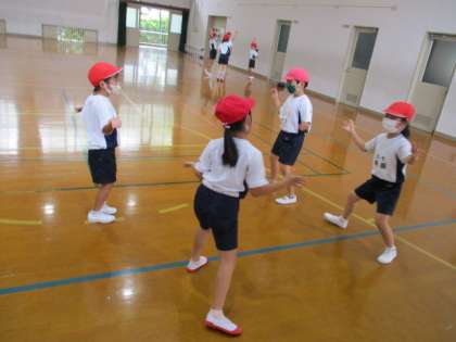 ジャンプしたり,ステップをふんだり,手や足を大きく回したり。