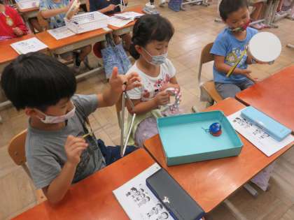 トライアングル,すず,カスタネット,タンブリンの4種類の楽器を持ち方や鳴らし方を試してみました。