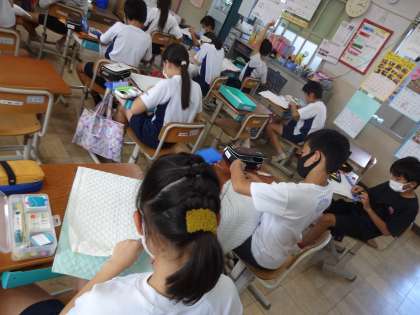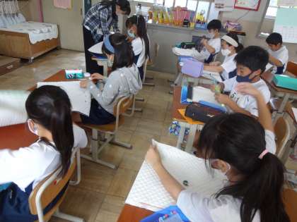 家庭科の学習のナップサックづくり。一針一針縫い進め…,ナップサックの形になってきました!!形になっていくのが嬉しくてたまらない様子の子ども達。縫ったあとに,布をひっくり返すと,完成に近い形に・・・!!「おー,かっこいい!!」と友達と声をかけ合う姿がキラリです。