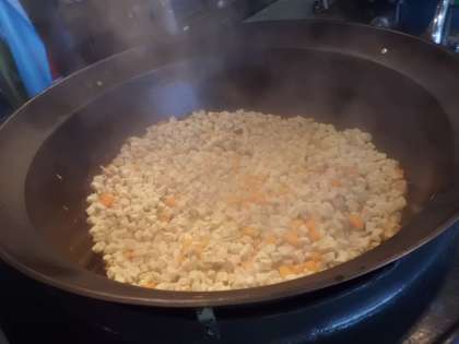 別の釜で,とり肉・にんじん・しいたけを煮,野菜が柔らかくなったところへ,味のしみ込んだこうやどうふを入れ,最後に一緒に合わせて煮て仕上げています。