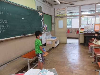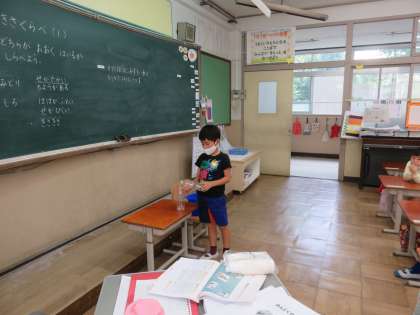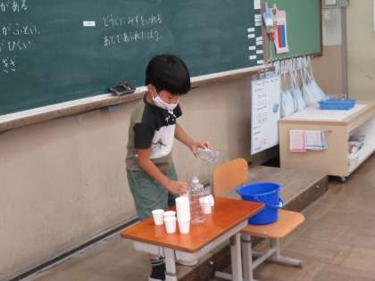 算数科では「おおきさくらべ(1)」の学習が進んでいます。前回はどちらが長いかを比べる方法を話し合いました。今日は形の異なる入れ物を見て「どちらが多く入るか」水のかさを比べる方法について話し合いました。