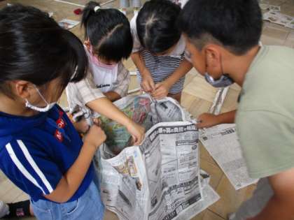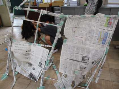 班の中では,新聞紙を細く丸める係やセロハンテープでつないでいく係,つなぎ合わせるところを持つ係など,さまざまな役割ができていました。組み立てていくにつれて,思い描いていたものとかけ離れていく班も!でも,すぐにその形から違う構想ができたみたいです。立体になってきた班が多くなってきました。完成した後は,みんなで鑑賞会をしました。作った形の中に入ったり,くぐったり,体全体で作ったものの良さを感じていました。