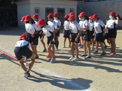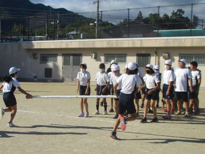 体育科の学習で,体育学習発表会に向けて,団体競技「台風の目」の練習に取り組んでいます。下を通る棒に当たらないように跳んだり,列をそろえたりするなど,作戦を考える姿がたくさん見られました。大原野旋風を巻き起こそう!