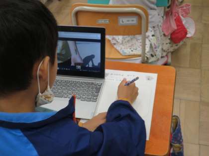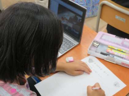 先日の生活科の時間に運動場で学校にいる生き物を見つけに行きました。今日はその時に見つけたたくさんの生き物を友だちに紹介するカードを書きました。