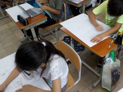 図画工作科の学習では,「読書感想画」を描いています。「宇宙人がいた」と「アパートのひとたち」の2冊から自分が描きたい本を選んで,登場人物や背景などを想像しながら描き始めています。最後までがんばって描いてほしいと思います。