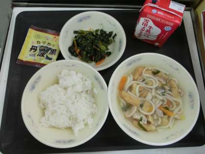体育学習発表会の日の給食は,ポカポカ温まる「かやくうどん」でした。