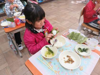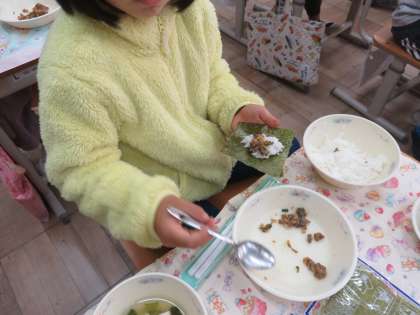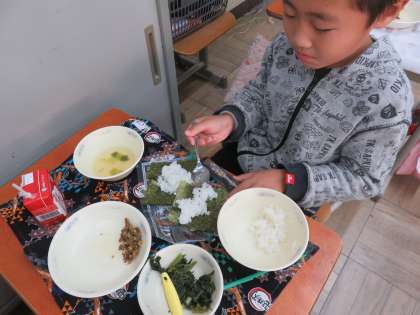 今日の給食は肉みそ納豆。手巻きののりがついていたので,自分でご飯をのせて肉みそ納豆をのせて海苔巻きを作って食べました。自分で海苔巻きを作るのがとても楽しかったらしくみんな笑顔いっぱいの給食時間でした。