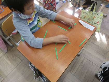 今日の算数科の時間はかぞえぼうをつかってのかたちづくりをしました。