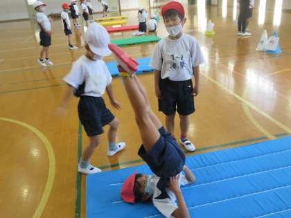 ひとりが技の練習をしているところを横でもう一人が見守ります。うまくできたところは褒めて,もう少しのところはアドバイスをしてふたりで上手になっていきたいと思います。