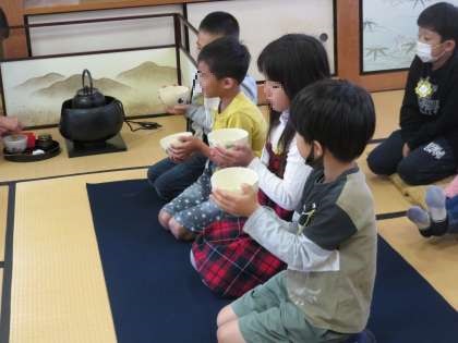「大原や」で,茶道の体験をさせていただきました。畳のお部屋でのご挨拶の仕方を教えていただいた子どもたち。真剣な面持ちでお菓子やお茶を頂いていました。