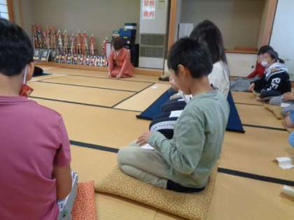 コミュニティプラザの皆様に教えていただいて,自分で抹茶を点てていただきました。茶せんを指先だけを動かして点てるのは,実際にやってみると難しいようでした。正座をして,礼の仕方も教えていただきました。