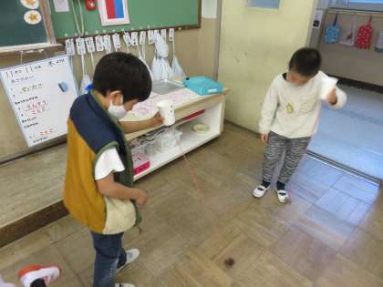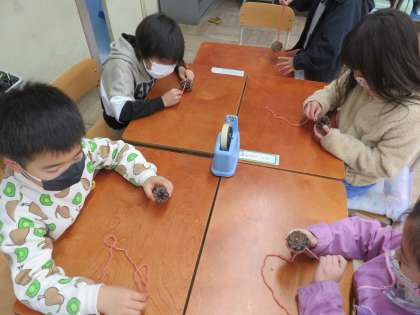 松ぼっくりにひもを結び付けたり,紙コップにひもを通したりして作りました。最後に紙コップに絵を描いて世界に一つだけの素敵なけん玉ができました。